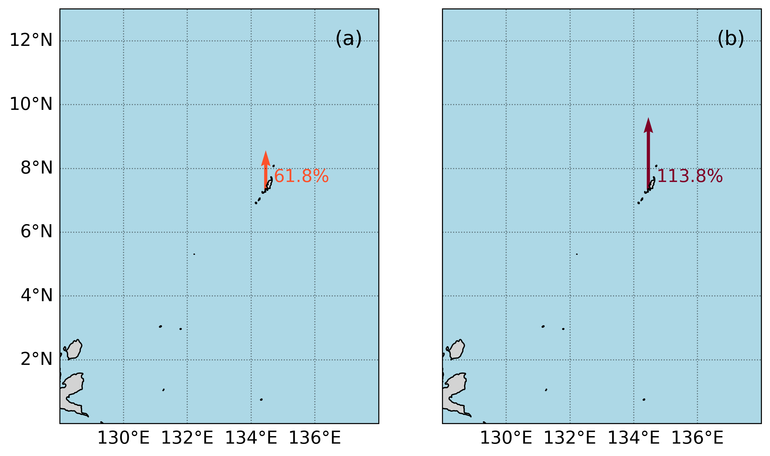 Fig. 2.5 Map of the percent change in average flood (a) days and (b) hours per year above a threshold of 30.0 cm above MHHW per year at Malakal,Palau tide gauge from 1983-01-01 to 2022-11-14#